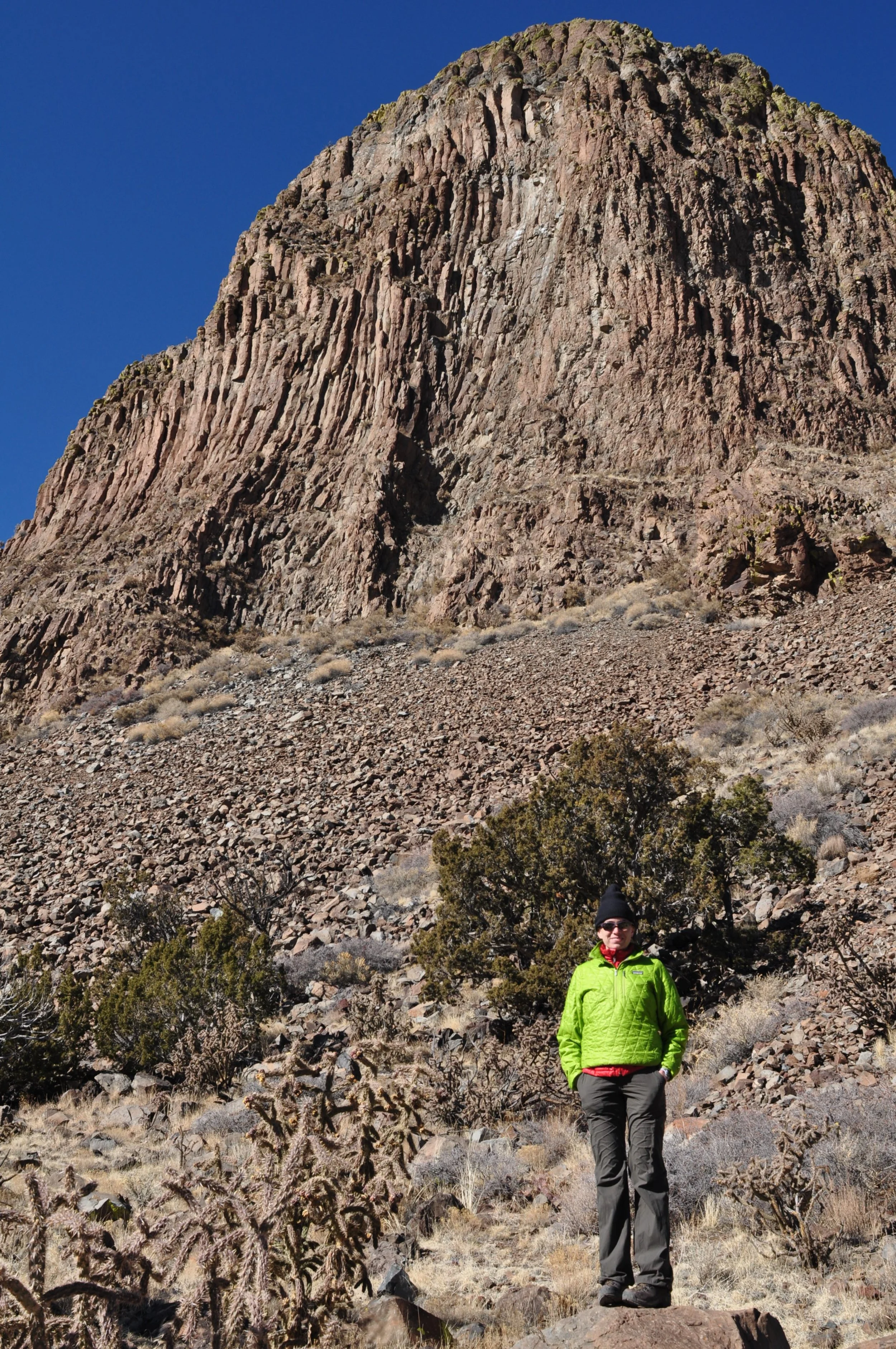 Basaltic columns, formed as the basalt cooled, sweep upward. Cabezon Peak presents a challenging climb with high exposure and fantastic views of the Rio Puerco drainage from the top. Photo by John Donahue.