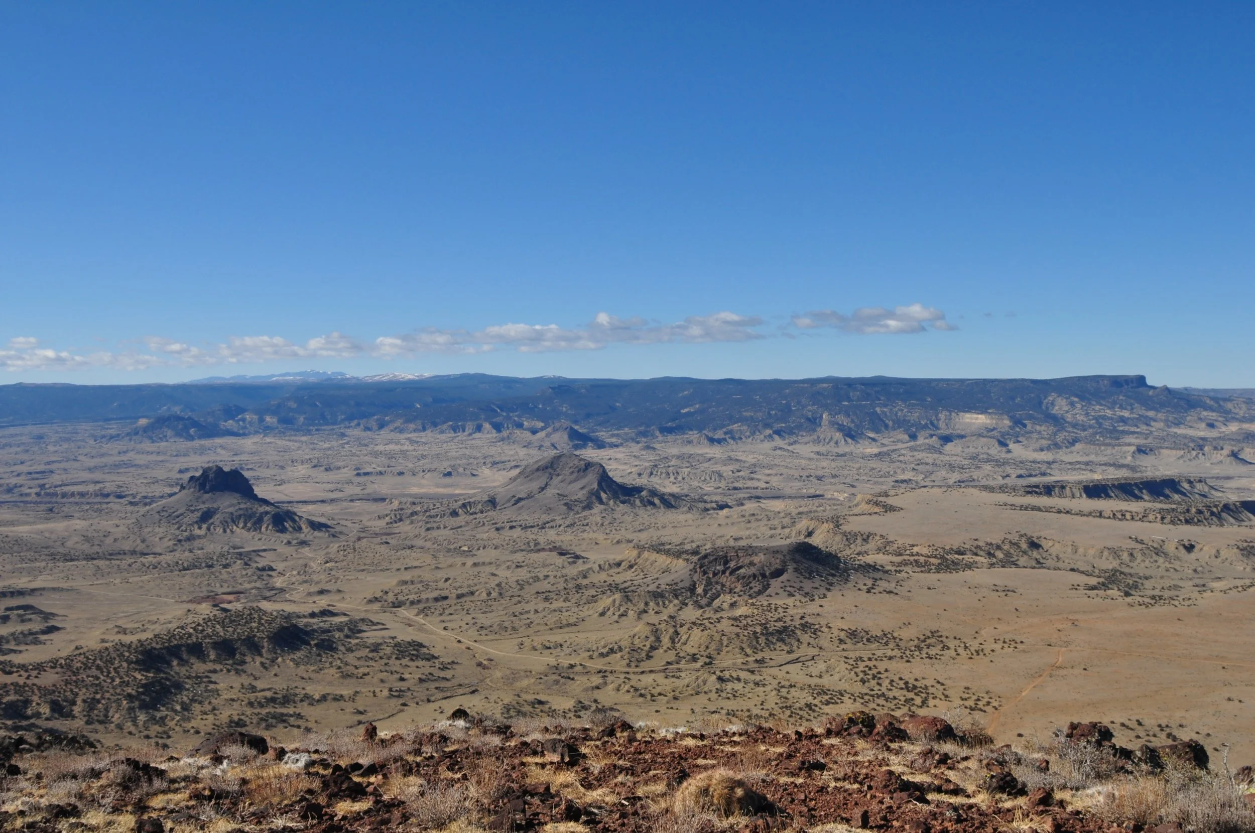Sweeping views from the top of Cabezon Peak show other smaller volcanic necks, the larger Mesa Chivato, and Mt. Taylor in the far distance. Photo by Magdalena Donahue.